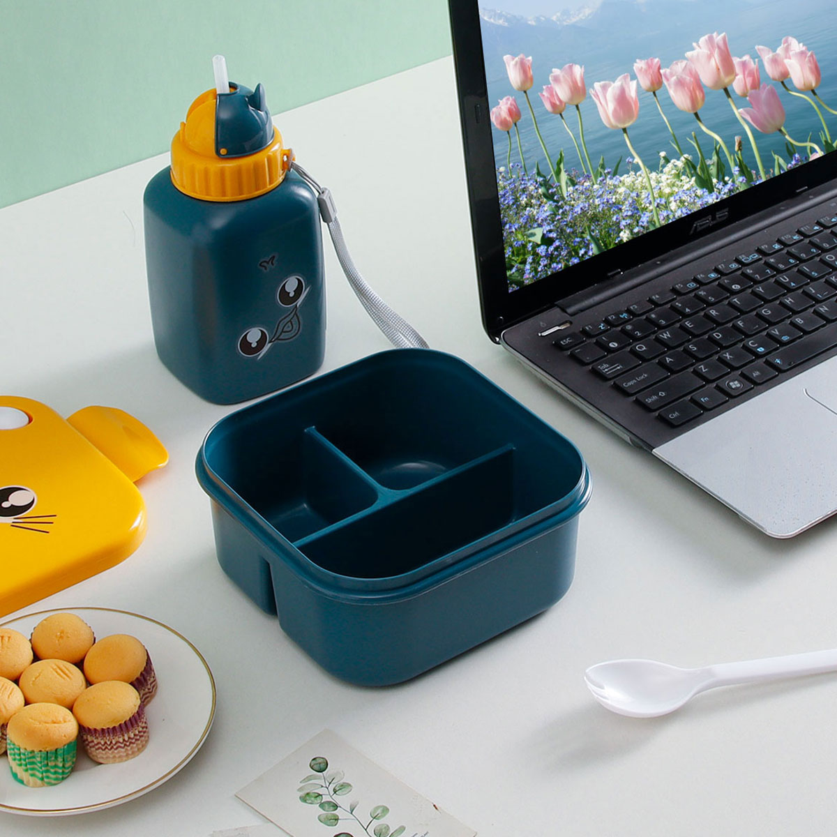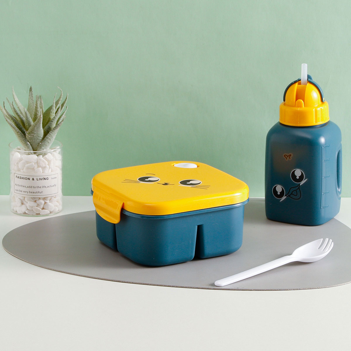 三格方型飯盒+600ml卡通水壺