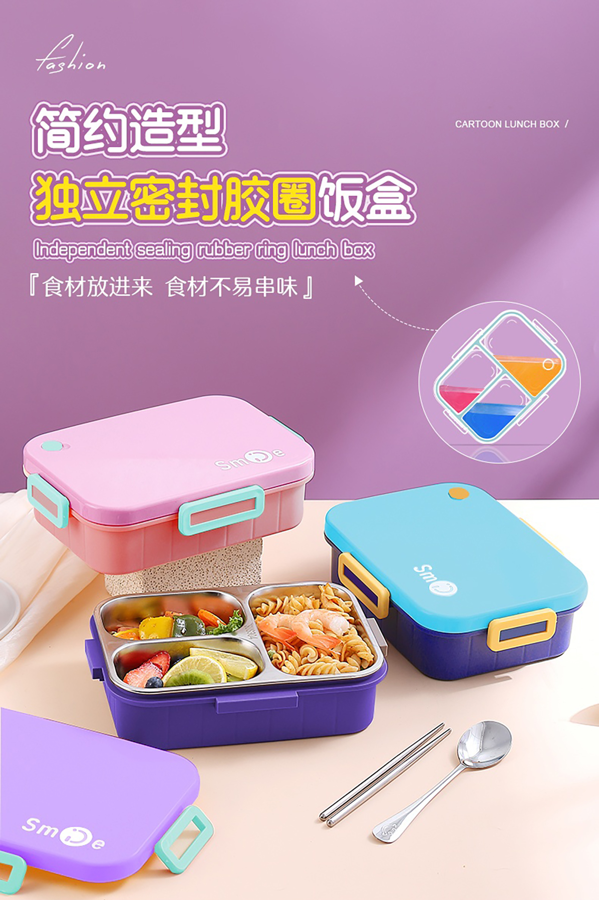 獨立密封不銹鋼餐盒(時尚二格800ml/三格750ml+不銹鋼勺筷)