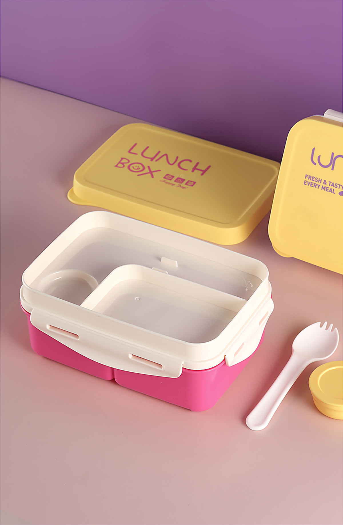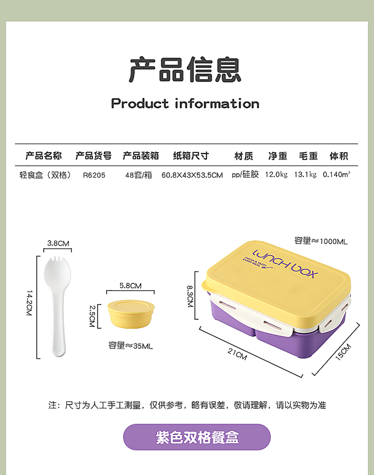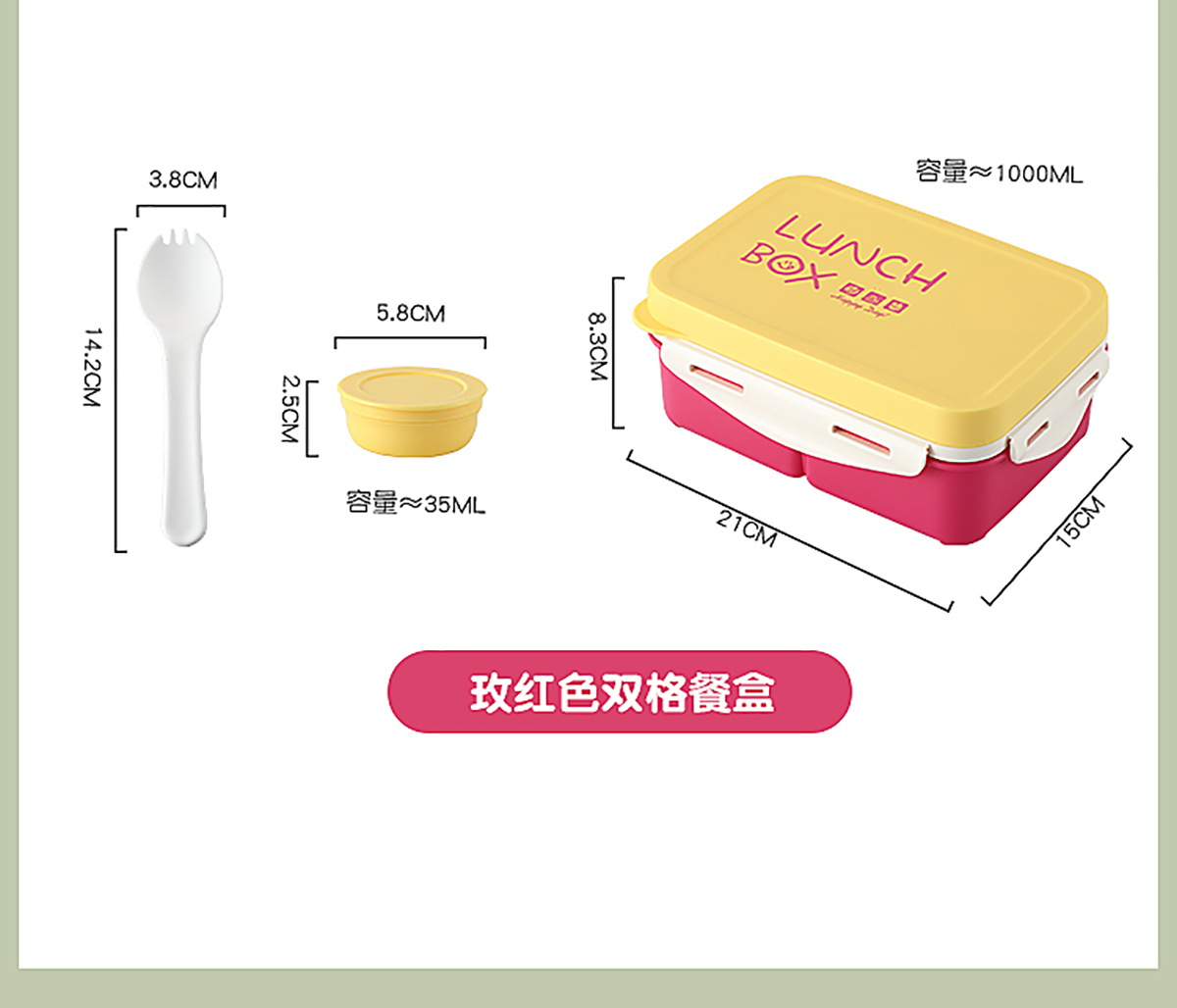 Size: 飯盒:210*150*83mm/1000ml 醬料盒:58*25mm/35ml 叉子:38*42mm