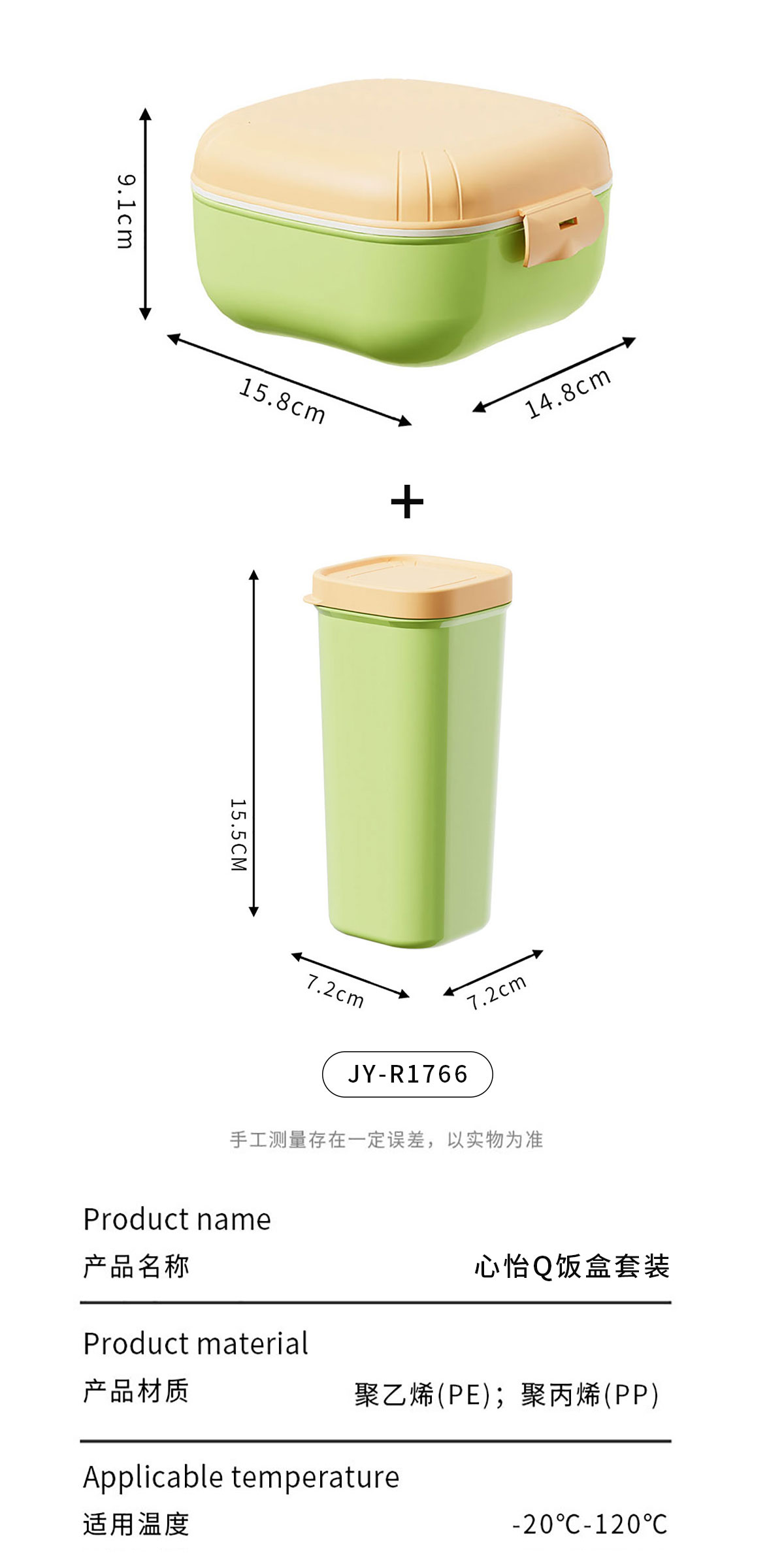 Size: JY-R1764(方形):148*148*90mm JY-R1766(套裝):飯盒:148*148*90mm/750ml 水杯:156*70*70mm/480ml