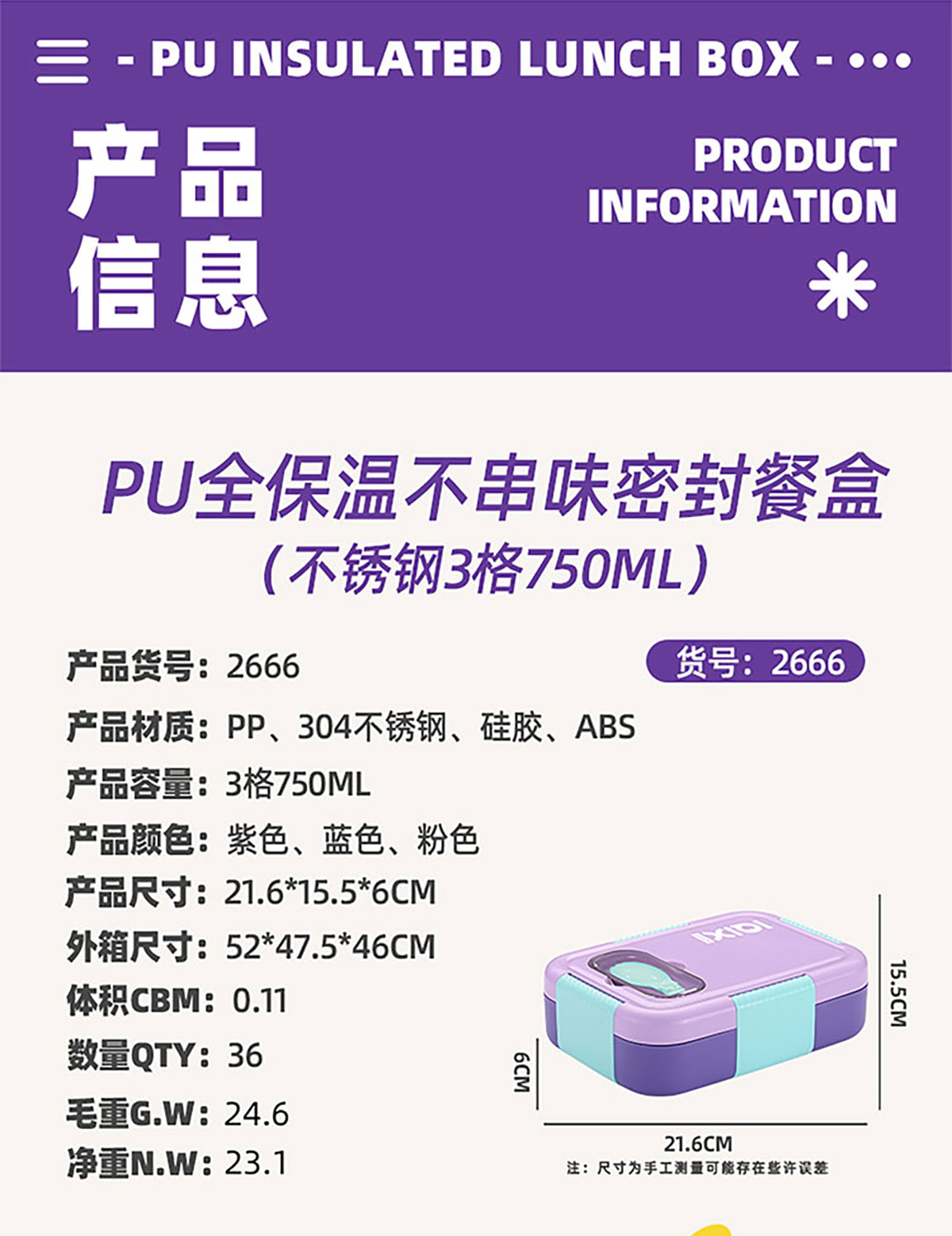 Size: AQX-2666(3格):216*155*60mm/750ml AQX-2667(2格):216*155*60mm/800ml